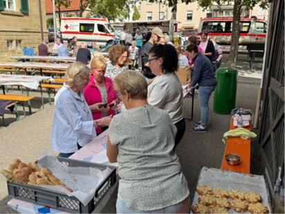 Der Ruf der Streusel aus dem Backhaus ist legendär, die Nachfrage entsprechend groß. Im Hintergrund informiert der DRK-Ortsverein über seine Arbeit und seine Ausstattung.